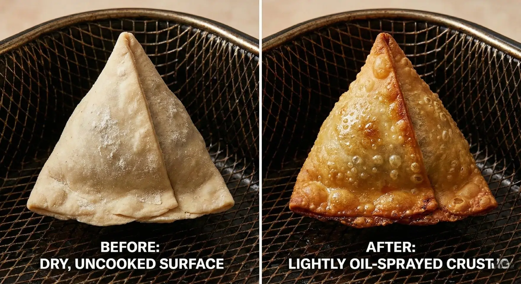 Split-screen of a dry pale samosa versus a golden-brown oiled samosa, demonstrating the Maillard reaction in an air fryer.